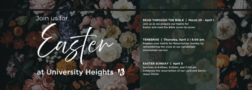 University Heights Baptist Church is a place where people can meet Jesus, engage in life-giving community, and where everyone is welcome. We believe in creating a space where people can have authentic encounters with Christ, and discover their gifts so they can use them for God's glory. Join us for our Sunday Worship on-Campus or ONLINE!
