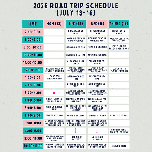 Clothes for 3-4 days, closed-toed shoes for Buckner's Warehouse and camp ground activities, sun screen, hat/sun covering, toiletries, twin bedding, bath towel, beach towel, modest swimsuit (and covering), refillable water bottle, bible, spending card/money (1 lunch stop at Six Flags & 1 dinner stop coming home on Thursday).