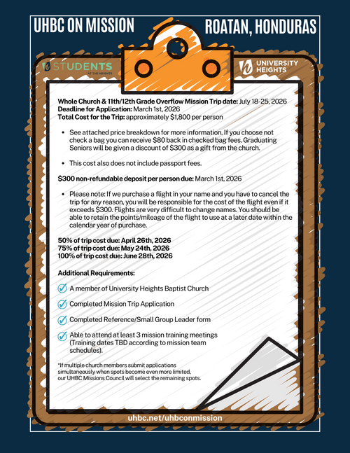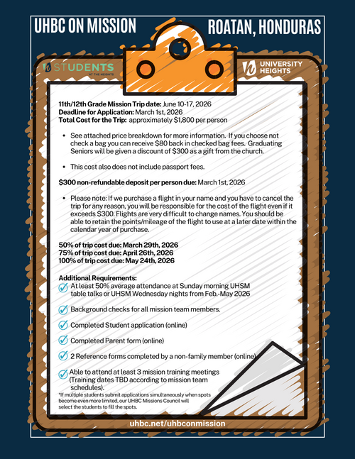 11th and 12th grade students and/or UHSM parents or UHSM adults applying for the Roatan, Honduras Mission Trip.